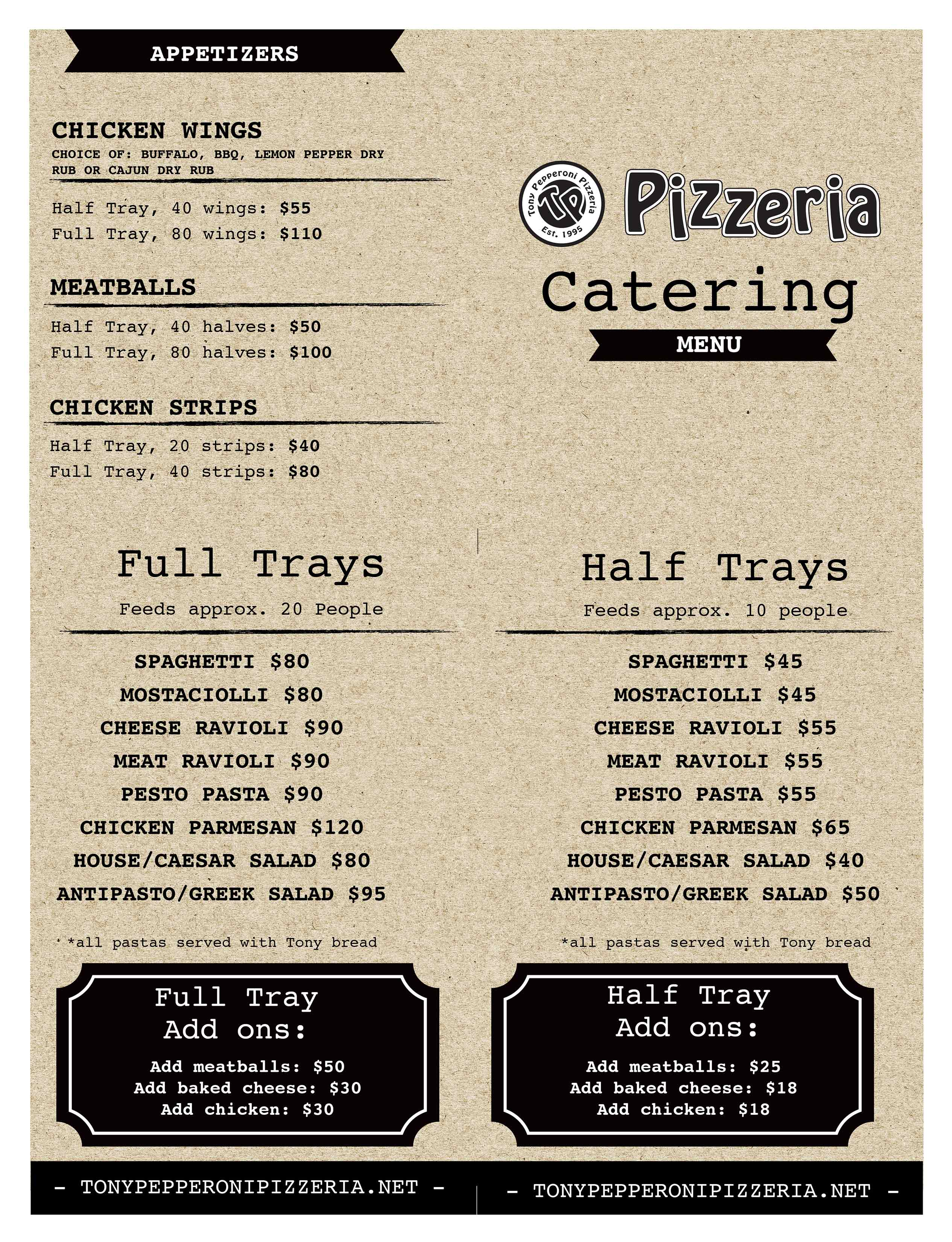 Tony Pepperoni Pizzeria and our team would love to become a part of your family or organization. We have a great menu created from the highest quality ingredients and atmosphere that we believe will leave a lasting impression on your party and guests. Please give us a call and plan your next catered event with us.